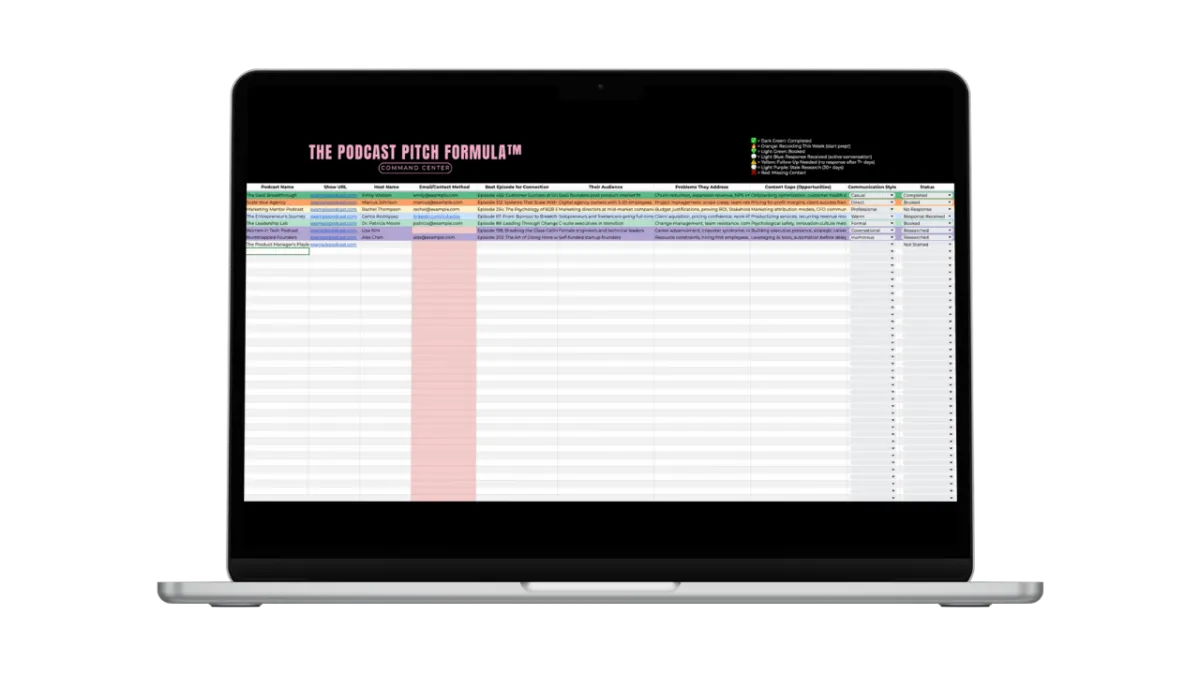 The Podcast Command Center: My done-for-you tracking system that manages 1000+ podcast targets, never lose track of an opportunity again ($497 value).